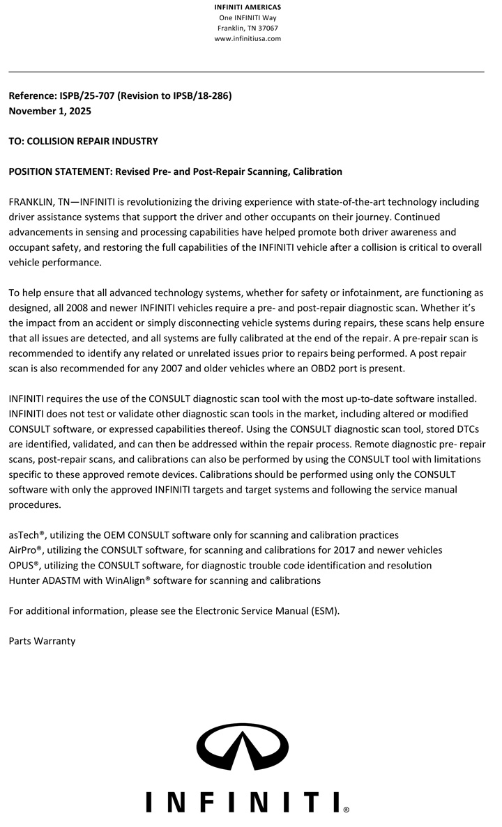 The updated Nissan Pre- and Post-Repair Scanning, Calibrations position statement and the INFINITI Revised Pre- and Post-Repair Scanning, Calibration position statement explains which vehicles require scanning, why scans are performed, and approved scan tools.