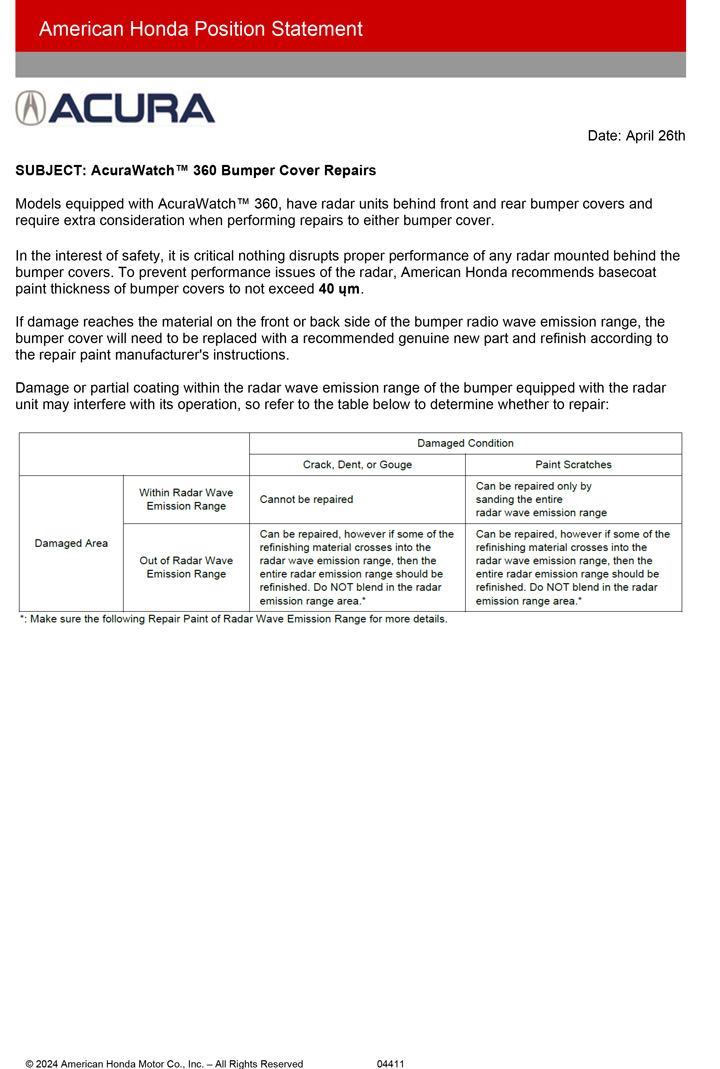 Quick Search By VehicleOEM InformationCollision Repair NewsOEM Calibration Requirements SearchOEM Partial Part Replacement SearchOEM Restraints System Part Replacement SearchOEM Hybrid And Electric Vehicle Disable SearchOEM Glass ReplacementI-CAR Best PracticesJust In TimeAsk I-CAR Submit a new collision repair question here! Follow us on @Ask_ICAR for daily updates. Home / OEM Information / Acura / Acura Position Statements Details Acura Position Statements 2025 Post-Collision Diagnostic Scan And Calibration Requirements Aiming Driving Support Systems 2024 AcuraWatch 360 Bumper Cover Repairs Recommended Sealers And Adhesives For Collision And Body Repairs 2023 Getting Started Using Electronic Target Positioning Systems 2019 Installation Of Aftermarket / Alternative Accessories NSX Exterior Paint Handling Information Use Of Additives, Fluids, And Flushes In Service Maintenance 2018 Driver Assist / Safety Systems May Fail Unless OE Parts Used 2016 2017 NSX: Collision And Body Damage Repair Process SRS Indicator On With No DTCs Or With Open Circuit DTCs Use Of Salvage / Recycled Parts 2015 Aftermarket Replacement Windshield May Cause Honda Sensing Systems To Work Abnormally 2012 SRS Replacement Parts Seat Covers And Side Airbag Components SRS Occupant Detection System (ODS) Troubleshooting And Repair Information 2010 Replacement Of Structural Parts Safety Recalls Acura Genuine Parts 2008 Use Of Aftermarket / Alternative Parts 2007 Acura Unibody Repair Steel And Aluminum Wheel Repair Salvaged And Used Air Bag System Components
