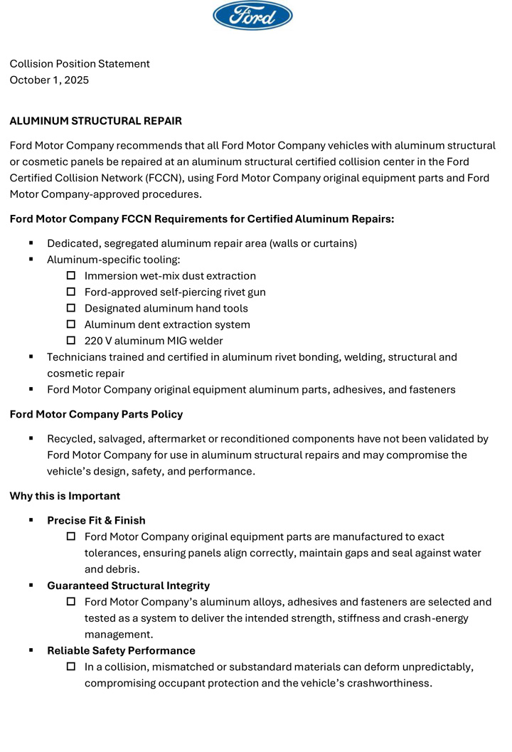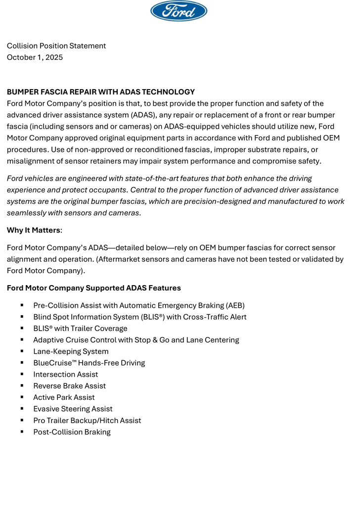 Quick Search By VehicleOEM InformationCollision Repair NewsOEM Calibration Requirements SearchOEM Partial Part Replacement SearchOEM Restraints System Part Replacement SearchOEM Hybrid And Electric Vehicle Disable SearchOEM Glass ReplacementI-CAR Best PracticesJust In TimeAsk I-CAR Submit a new collision repair question here! Follow us on @Ask_ICAR for daily updates. Home / OEM Information / Ford / Ford Statements Details Ford Collision Position Statements 2025 Use Of Genuine Ford Original Equipment Parts Use of OEM Structural Fasteners And Adhesives Use Of Salvaged Supplemental Restraint Systems And Components Pre- And Post-Diagnostic Scanning During A Collision Repair Remanufacturing Or Refinishing Steel And Aluminum Wheels Structural Repairs Use Of Ford OEM Glass Aluminum Structural Repair Bumper Fascia Repair With ADAS Clearcoat Blending Procedure Not Approved Clip Repair Procedure Not Approved