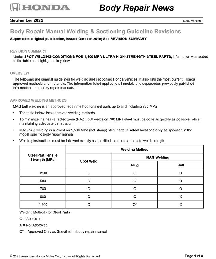 Quick Search By VehicleOEM InformationCollision Repair NewsOEM Calibration Requirements SearchOEM Partial Part Replacement SearchOEM Restraints System Part Replacement SearchOEM Hybrid And Electric Vehicle Disable SearchOEM Glass ReplacementI-CAR Best PracticesJust In TimeAsk I-CAR Submit a new collision repair question here! Follow us on @Ask_ICAR for daily updates. Home / OEM Information / Honda / Honda Body Repair News Details Honda Body Repair News 2025 2026 Passport Series: Body Repair Information Body Repair Manual Welding And Sectioning Guideline Revisions 2024 2024 Prologue Model Series: New Body Repair Information 2022 Civic Model Series: New Body Repair Information 2025 CR-V e:FCEV (Fuel Cell): New Body Repair Information 2023 2023 Accord Model Series: New Body Repair Information 2022 2023 HR-V Model Series: New Body Repair Information 2023 CR-V and CR-V Hybrid Model Series: New Body Repair Information 2020 2017 CR-V And 2020 CR-V Hybrid Series: Body Repair Information Corrosion Protection 2018 Odyssey: Body Repair Information 2019 2017 Ridgeline Series: Body Repair Information Approved High-Strength-Steel Welding Wire 2019 Passport Series: Body Repair Information Side Windshield Trim Or Roof Molding Installation 2015 Fit Series: Body Repair Information 2017 Clarity Series: Body Repair Information 2019 Insight Model Series: New Body Repair Information 2018 Accord Hybrid Series: Body Repair Information 2018 Accord Series: Body Repair Information 2016 HR-V Series: Body Repair Information 2019 HR-V Sport Gloss Black Application 2012-15 Civic 4-Door: Rear Floor Panel Set 2016 Civic: Body Repair Information 2016 Pilot: Body Repair Information 2018 Structural Adhesive For Body Component Replacement 2017 Honda-Approved Collision Repair Tools Now Available 2015 2013 Accord: Body Repair Information 2014 2012 CR-V: New Model Body Repair Information 2009-15 Pilot: Body Repair Information 2013 2011 Odyssey: New Model Body Repair Information 2014 Accord Plug-in And Hybrid: New Model Body Repair Information