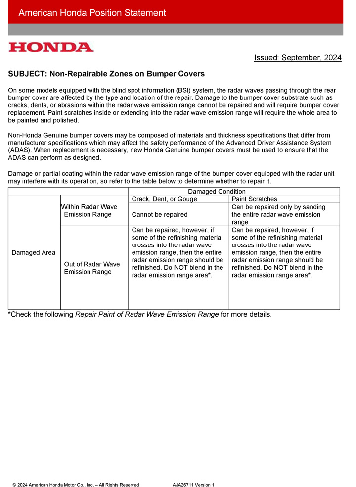 Quick Search By VehicleOEM InformationCollision Repair NewsOEM Calibration Requirements SearchOEM Partial Part Replacement SearchOEM Restraints System Part Replacement SearchOEM Hybrid And Electric Vehicle Disable SearchOEM Glass ReplacementI-CAR Best PracticesJust In TimeAsk I-CAR Submit a new collision repair question here! Follow us on @Ask_ICAR for daily updates. Home / OEM Information / Honda / Honda Position Statements Details Honda Position Statements 2025 Post-Collision Diagnostic Scan And Calibration Requirements Aiming Driving Support Systems 2024 Non-Repairable Zones On Bumper Covers Recommended Sealers And Adhesives For Collision And Body Repairs 2023 Getting Started Using Electronic Target Positioning Systems 2020 Service Manual Update: CR-V And CR-V Hybrid Alignment Specification 2019 Installation Of Aftermarket / Alternative Accessories Use Of Additives, Fluids, And Flushes In Service Maintenance 2018 Driver Assist / Safety Systems May Fail Unless OE Parts Used 2017 Clarity Electric, Fuel Cell, Or Plug-In Hybrid HV Battery Inspection After SRS Deployment Or Structural Damage 2016 SRS Indicator On With No DTCs Or With Open Circuit DTCs Use Of Salvage / Recycled Parts 2015 Aftermarket Replacement Windshield May Cause Honda Sensing Systems To Work Abnormally 2012 SRS Replacement Parts Seat Covers And Side Airbag Components SRS Occupant Detection System (ODS) Troubleshooting And Repair Information 2010 Replacement Of Structural Parts Safety Recalls Honda Genuine Parts 2008 Use Of Aftermarket / Alternative Parts 2007 Steel And Aluminum Wheel Repair Honda Unibody Repair Salvaged And Used Air Bag System Components