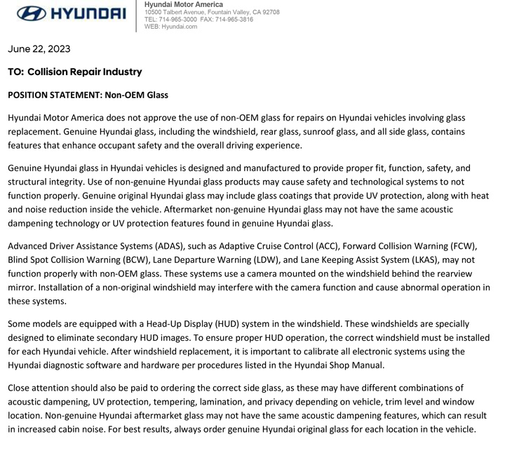 Quick Search By VehicleOEM InformationCollision Repair NewsOEM Calibration Requirements SearchOEM Partial Part Replacement SearchOEM Restraints System Part Replacement SearchOEM Hybrid And Electric Vehicle Disable SearchOEM Glass ReplacementI-CAR Best PracticesJust In TimeAsk I-CAR Submit a new collision repair question here! Follow us on @Ask_ICAR for daily updates. Home / OEM Information / Hyundai / Hyundai Position Statements Details Hyundai Position Statements 2025 Repairing Front And Rear Bumpers With Corner Radar Units Or Ultrasonic Sensors Use Of Heat While Repairing Damaged Structural And Non-Structural Components Pre-Repair And Post-Repair System Scanning 2024 High-Voltage Battery Inspection And Replacement After Structural Damage 2023 Non-OEM Glass 2018 Aluminum And Steel Wheel Repair And Reconditioning Clip Repair Clear Coat Blending Non-OEM And Recycled Parts